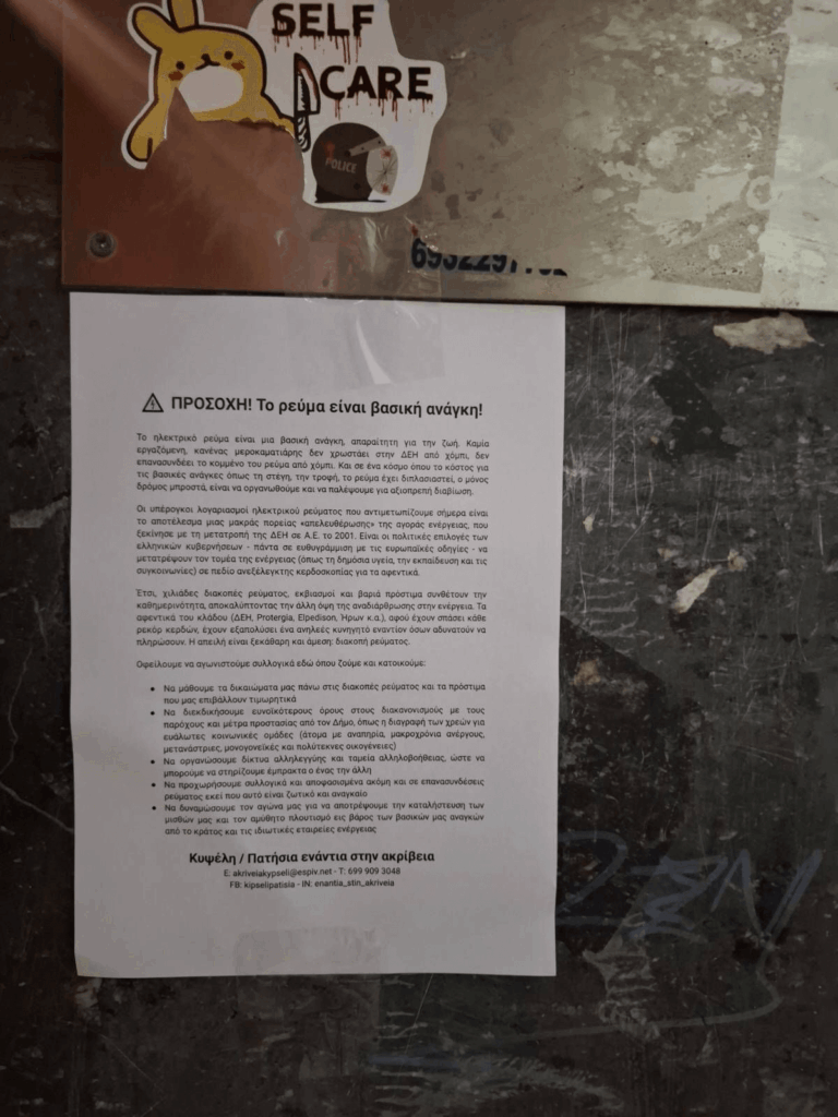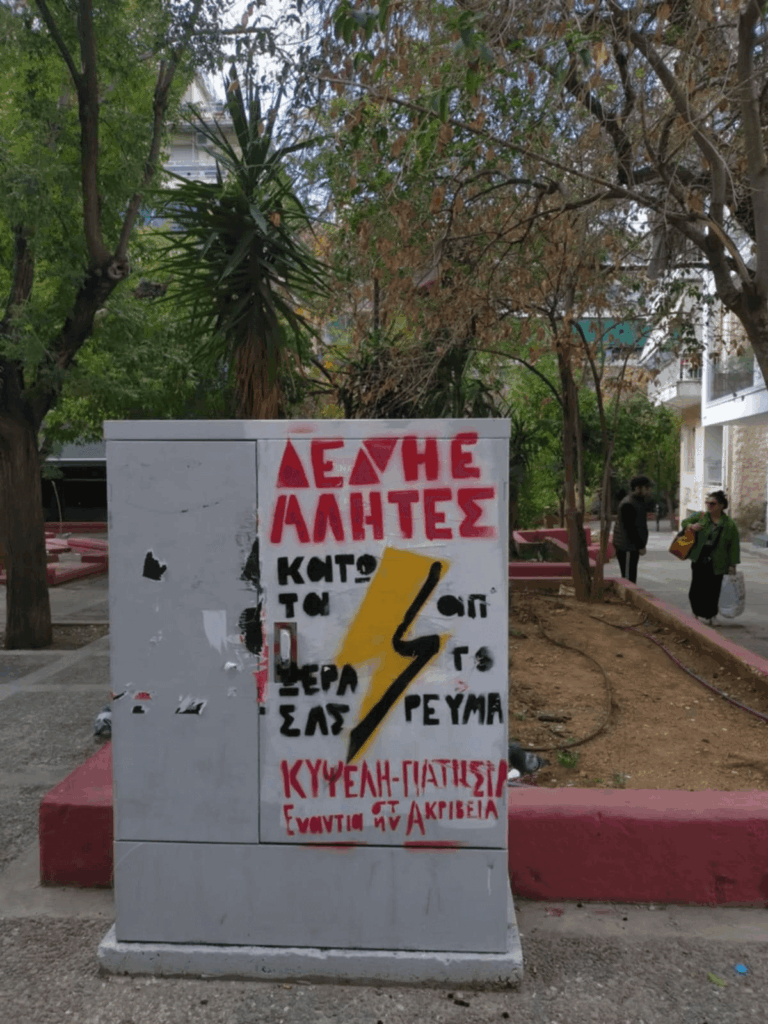 Στις εργατικές γειτονιές της Αθήνας, η ΔΕΔΗΕ σαν διαχειριστης δικτύου και αρα υπεύθυνος για τις διακοπές ρεύματος εχει σπάσει κάθε όριο αυθαιρεσίας. Με όχημα την «πιθανολογούμενη ρευματοκλοπή», ένα επιτηδευμένα γενικό όρο που βασίζεται σε «ενδείξεις αλλίωσης» του ρολογίου, χρεώνει αυθαίρετα πρόστιμα σε νοικοκυρία. Παραβιάζει ακόμη και τον δικό της εσωτερικό κανονισμό που επιβάλει την διεξαγωγή των ενστάσεων με την παρουσία του καταναλωτή. Τελικά αυτό που συμβαίνει είναι να αναγκαζόμαστε να πληρώσουμε το πρόστιμο και την αυθαίρετη υπερ-χρέωση της ΔΕΔΗΕ, καθότι η εναλλακτική είναι να τρέξουμε με δικηγόρους και έξοδα χωρίς καμια εγγύηση για πρόσβαση σε πραγματική ανεξάρτητη δικαιοσύνη. Αυτό την αισχρή αυθαίρεσια, ο αγώνας μας οφείλει να την στοχοποιήσει και να την τελειώσει.