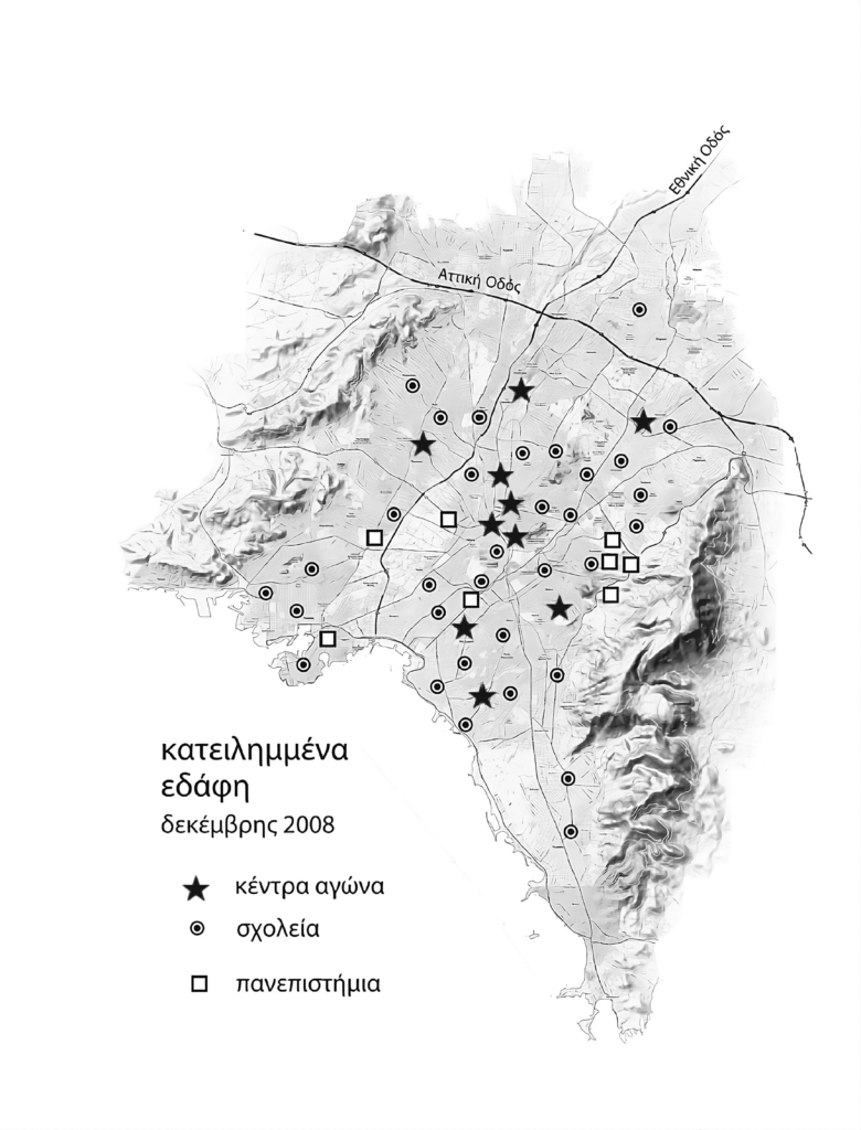 Το τέταρτο πράγμα που αξίζει να σκεφτούμε είναι η επαναδιαπραγμάτευση της χωρικής/γεωγραφικής/ εδαφικής διάστασης της ανταγωνιστικής δράσης στη διάρκεια της εξέγερσης. Αν ο Δεκέμβρης περιοριζόταν σε τρεις δρόμους του κέντρου της Αθήνας, θα είχε σβήσει ήδη από την δεύτερη μέρα. Μπορεί να υπήρχε ένα κέντρο της εξέγερσης στη διάρκεια του Δεκέμβρη, τα Εξάρχεια, και η Πατησίων, στην πραγματικότητα ωστόσο η πρωτοβουλία της επέκτασης σε μια εκτεταμένη γεωγραφική έκταση και σε άλλα πεδία του κοινωνικού, είναι ο λόγος που παράτεινε και βάθυνε την εξέγερση. Κι αυτό κόντρα σε μια κεντροπολιτική αντίληψη αριστεράς και αναρχίας, όπου σταθερά προσκολλημένη στις αντιλήψεις των αρχών του περασμένου αιώνα, θεωρεί ότι το τρίγωνο Προπύλαια-Ομόνοια-Σταδίου-Σύνταγμα αποτελεί την πεμπτουσία της κυβερνητικότητας, αντίληψη ωστόσο, που εξακολουθεί και σήμερα να μας ταλαιπωρεί.