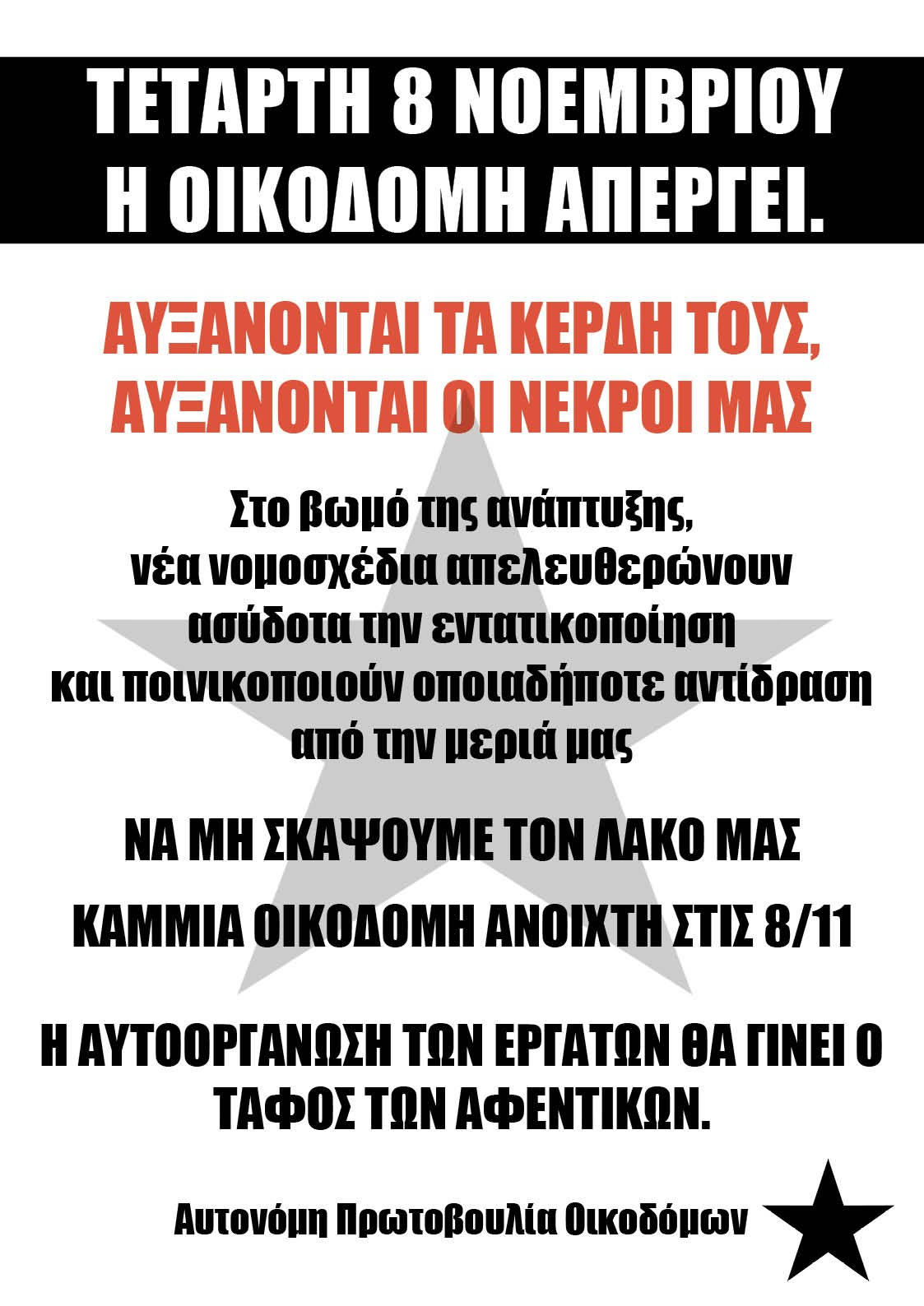 Γι’ όλους αυτούς τους λόγους οι εργαζόμενοι στον κλάδο της οικοδομής απεργούν στις 8/11. Για να φωνάξουν ένα «ως εδώ» απέναντι στο κράτος και στα αφεντικά που θέλουν να πεθαίνουμε στην δουλεία. Η επιτυχία της απεργίαςθα είναι σημαντικός σταθμός στον αγώνα για καλύτερους μισθούς και συνθήκες εργασίας.