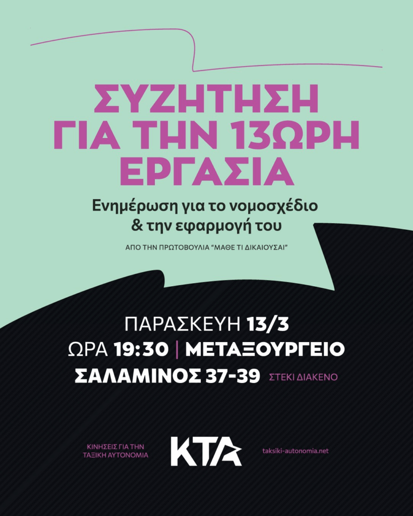 Συζήτηση για την 13ωρη εργασία – Ενημέρωση για το νομοσχέδιο και την εφαρμογή του // Παρ.13.03 4 Μαρτίου, 20264 Μαρτίου, 2026 Εκδηλώσεις/Εργασία ΣΥΖΗΤΗΣΗ ΓΙΑ ΤΗΝ 13ΩΡΗ ΕΡΓΑΣΙΑΕνημέρωση για το νομοσχέδιο και την εφαρμογή τουΑπό την πρωτοβουλία “Μάθε τι δικαιούσαι” Παρασκευή 13/3,19:30,Στέκι Διάκενο (Μεταξουργείο, Σαλαμίνος 37-39) Κινήσεις για την Ταξική Αυτονομία (ΚΤΑ) Tags: εργασία Share this Facebook Twitter You might be interested in 11 Φεβρουαρίου, 202612 Φεβρουαρίου, 2026 Η άποψη μας γύρω από τα σωματεία και τον συνδικαλισμό – Β’ μέρος 27 Ιανουαρίου, 202628 Ιανουαρίου, 2026 Έντυπο δρόμου New Worker Times – Tεύχος #3 13 Ιανουαρίου, 202620 Ιανουαρίου, 2026 Ανταπόκριση από την εκδήλωση: Αξιολόγηση & Ωνάσεια σχολεία